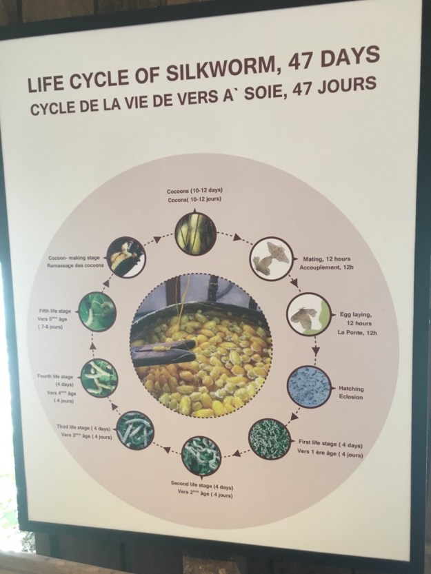 We visited Angkor Silk farm today and took a tour. As a side note, we have seen silk worms in the frozen section of grocery stores and also as a snack sold on the street. Our driver from Phnom Penh to Siem Reap stopped and bought some. We tried them. They taste like boiled peanuts with a sour filling.