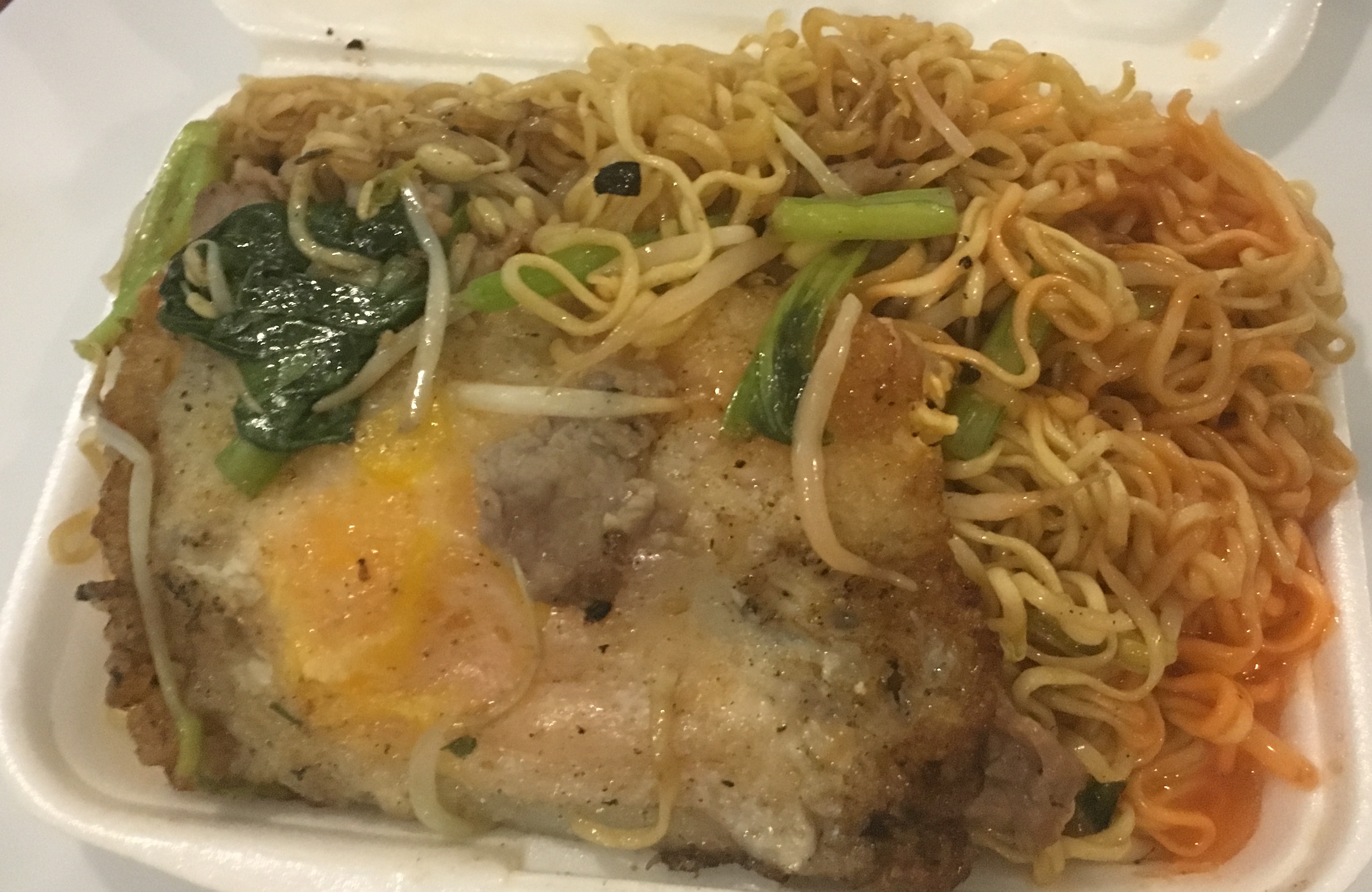 Noodles, egg, pork, greens, etc.